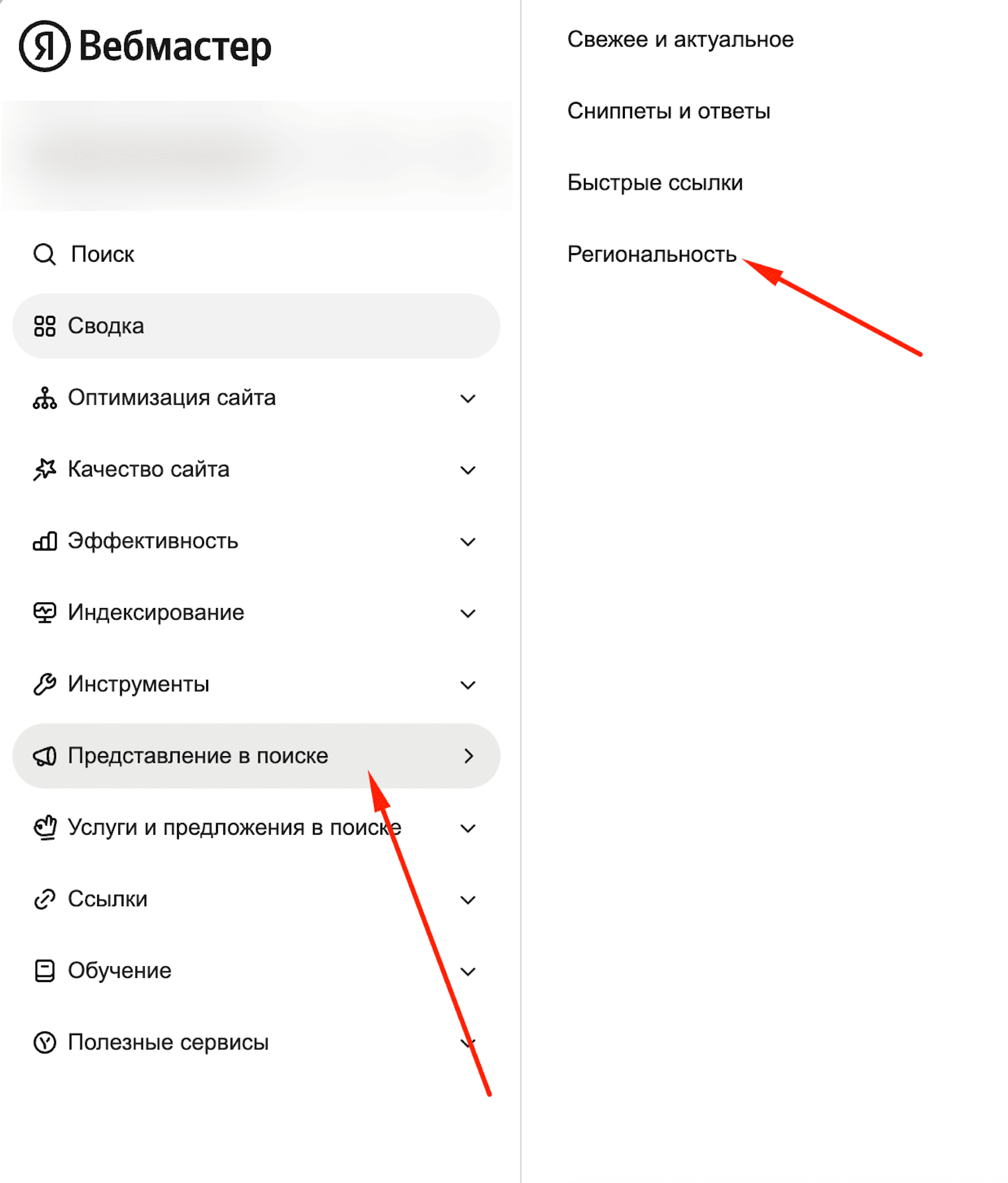 В разделе «Представление в поиске» → «Региональность» укажите географический регион, для которого предназначен сайт. Это поможет поисковику показывать ресурс пользователям из соответствующих регионов.