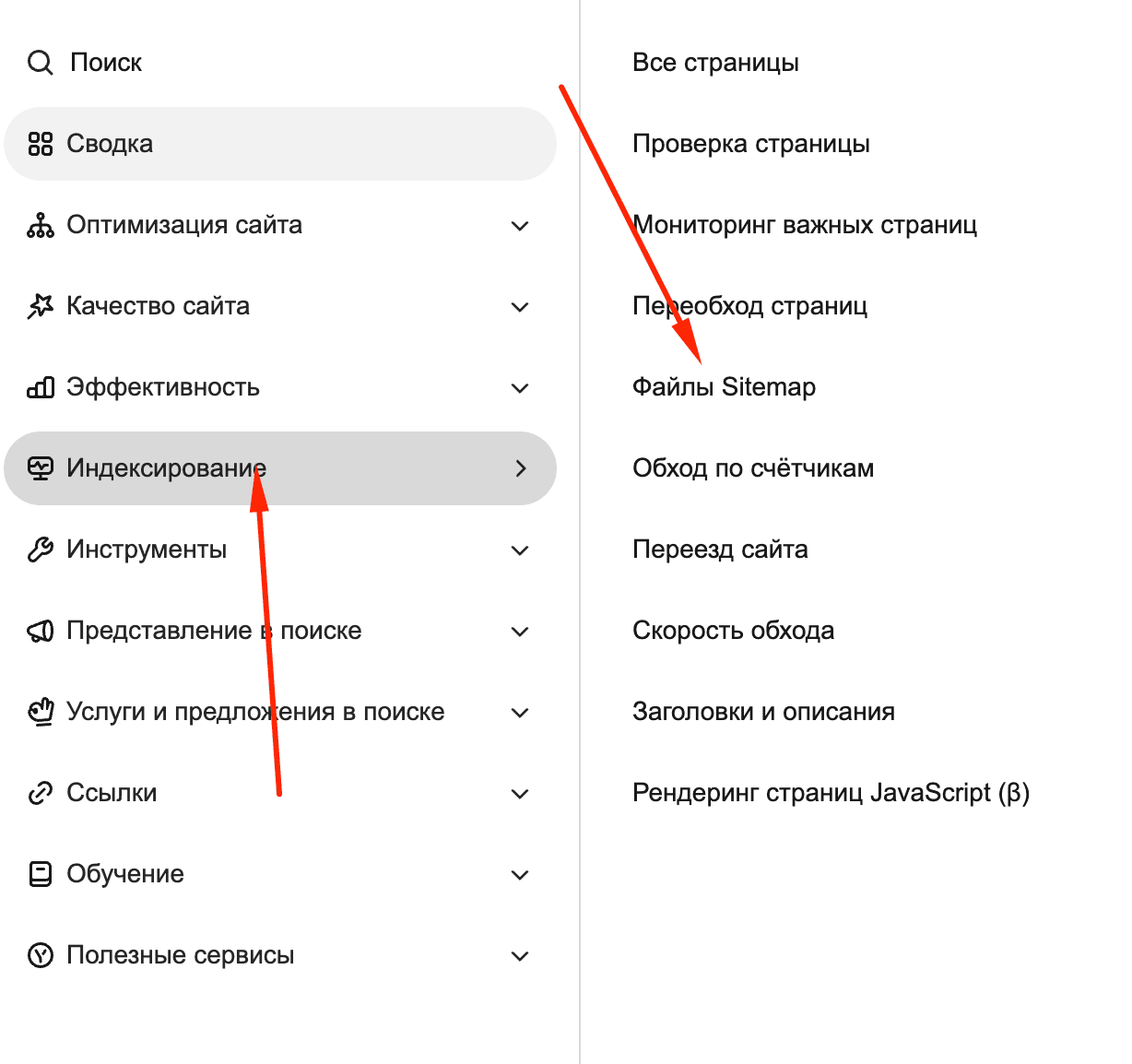 Карта (sitemap.xml) — это файл, который содержит список всех страниц вашего сайта. Создайте карту и загрузите её в панель через раздел «Индексирование» → «Файлы Sitemap».